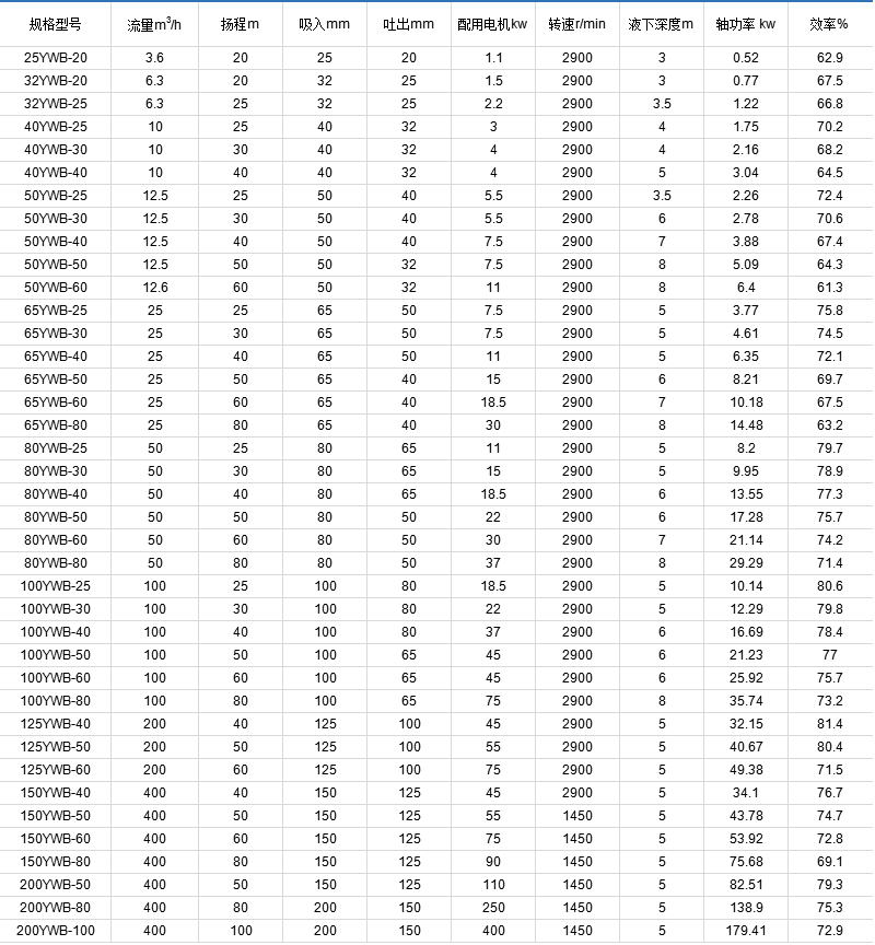 YWB液下无轴泵,适用于在-85℃~350℃条件下,长期输送任意介质酸、氧化剂及腐蚀性介质,广泛应用于化工、石油、制 药、农药、电子、电力、电镀、冶金、消防、环保、国防军工、稀土冶炼等行业。其液下深度最深可达8米,使用时间是一般长轴液下泵的数十倍,使用安装十分方便,克服了原单级单吸液下泵在运输安装运行过程中泵轴易弯曲变形(泵轴长度等于液下深度),轴承易损坏、轴套难以维修等缺点。