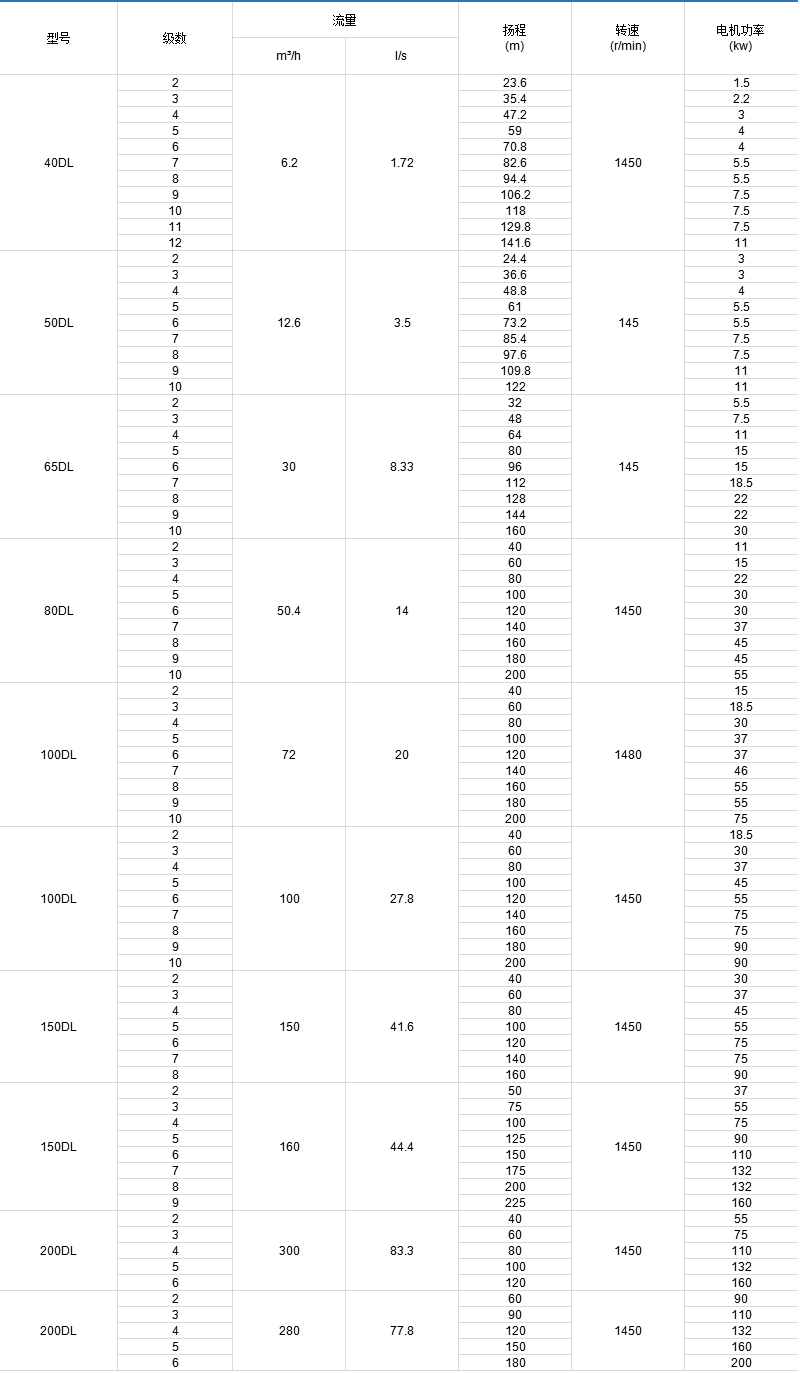 DL、DLR型泵系立式单吸多级分段式离心泵,供输送不含固体颗粒的清水及物理化学性质类似于水的液体之用。主要用于高层建筑供水,也可应用于厂矿给排水、输送液体的流量范围为6.2~280m3/h,扬程范围为18.5~225m,配套功率范围为1.5~200kw,口径范围为Ф40~Ф200mm。