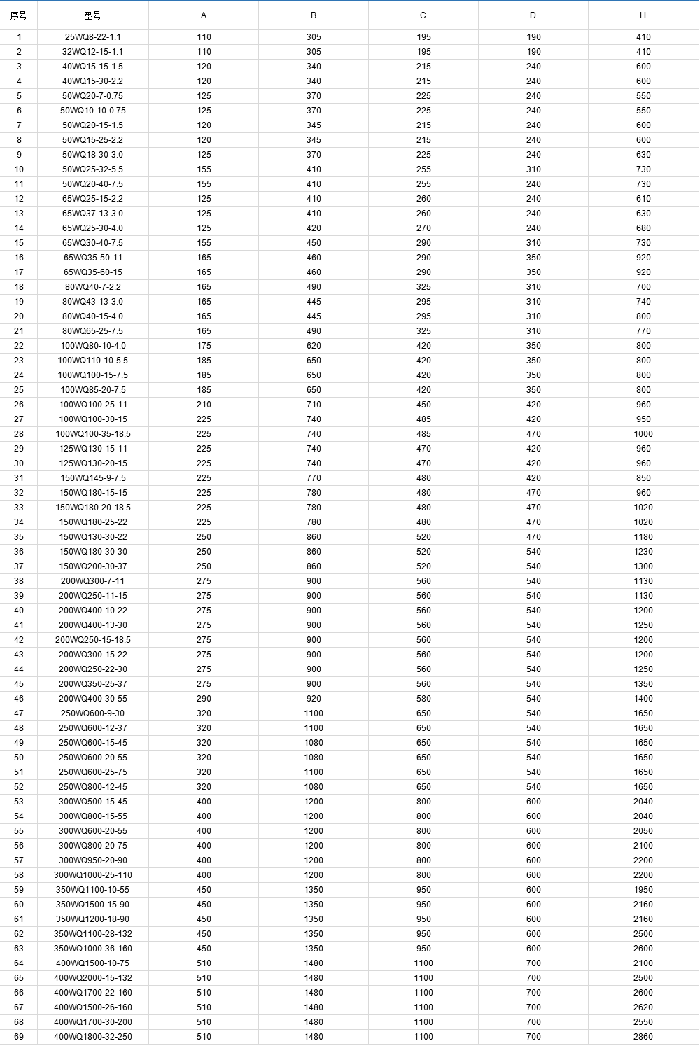 WQ型污水污物潜水泵,还采用不锈钢叶轮及国内先进的机械密封装置,使用寿命达3000小时以上。该泵广泛适用于抽送排放工业与生活废水、污水,包括含有纸浆、木榍、淀粉、泥砂、碎石、短纤维等渣浆,固体的也液体及尿粪等,是工业、农业、城市、建筑行业理想的给排污水工具。